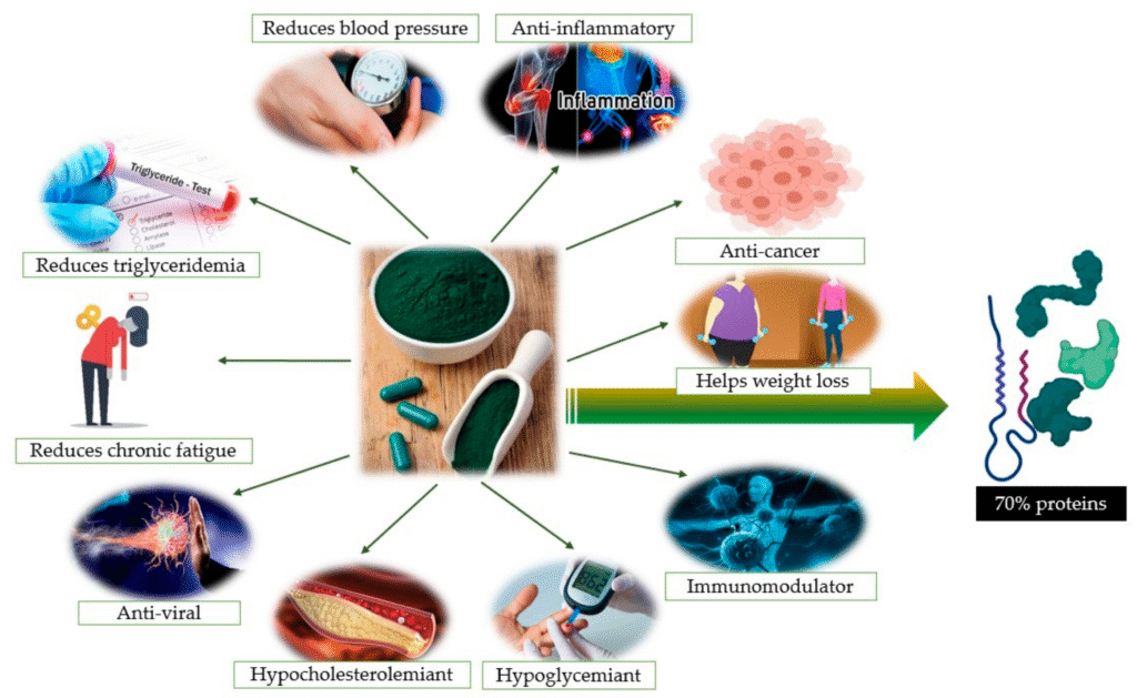 Spirulina (atau Arthrospira platensis), yang dikenali sebagai alga biru-hijau atau cyanobacterium, adalah kaya dengan protein dan pelbagai jenis nutrien lain. Ia merupakan salah satu sumber tambahan makanan semula jadi yang terbaik, terutama bagi individu yang mengamalkan pemakanan berasaskan tumbuhan.